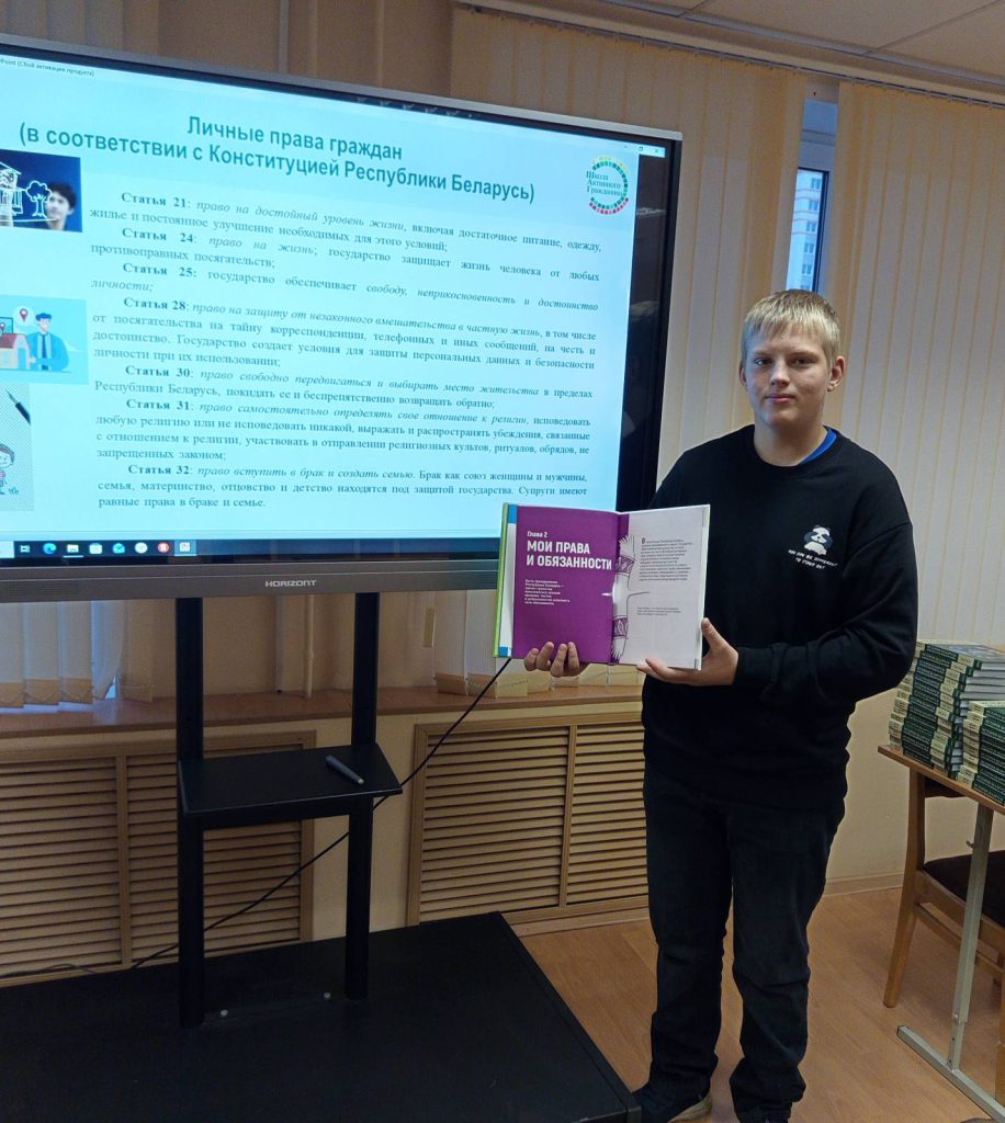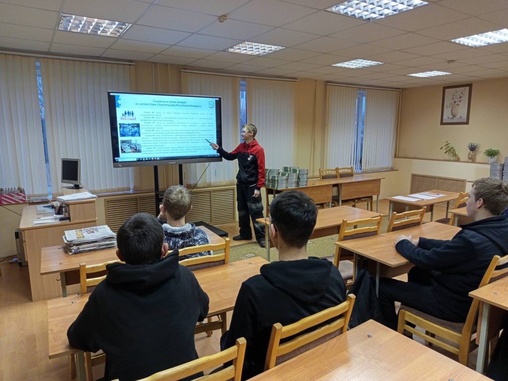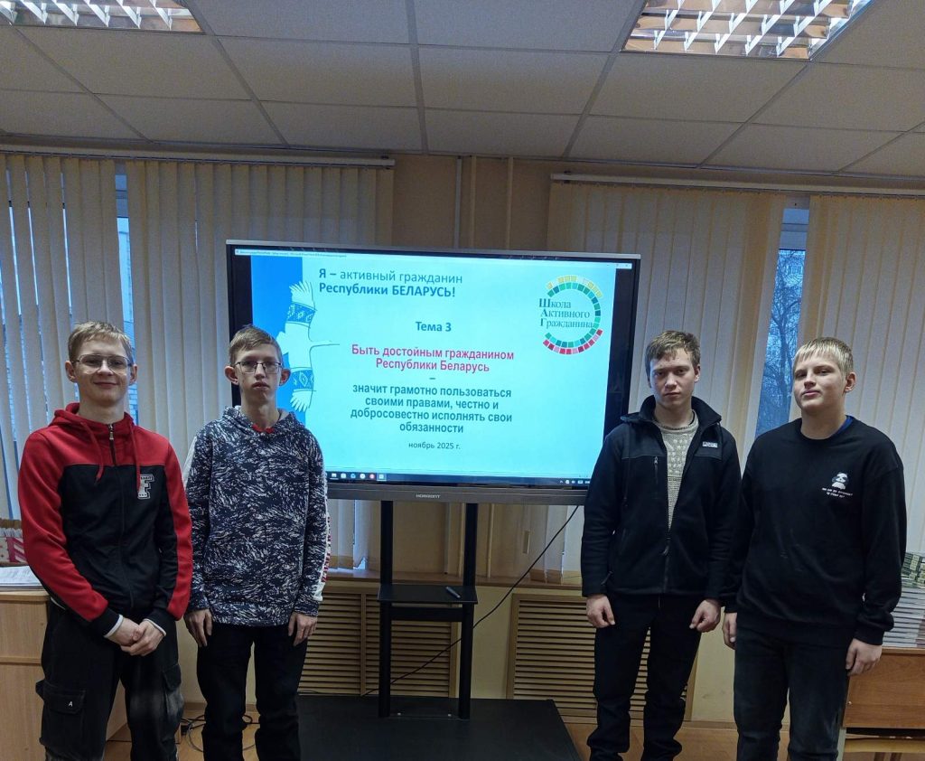 27 ноября 2025 года для учащихся первого курса прошло мероприятие в рамках информационно-образовательного проекта «ШАГ». Тема мероприятия «Быть достойным гражданином Республики Беларусь — значит грамотно пользоваться своими правами, честно и добросовестно исполнять свои обязанности». Во время мероприятия обсуждались вопросы, касающиеся конституционных прав и обязанностей гражданина Республики Беларусь, гарантий белорусского государства по защите прав и свобод граждан, обязанностей учащихся, прав ребенка, взаимосвязи прав и обязанностей. Во время беседы использовалось тексты пособия «Я — гражданин Республики Беларусь», Конституции Республики Беларусь, просмотрели ролик «Права человека. Права и свободы: в чём разница?». Это мероприятие стало важным шагом в воспитании у подрастающего поколения чувства патриотизма, активной гражданской позиции и гордости за свою страну.
