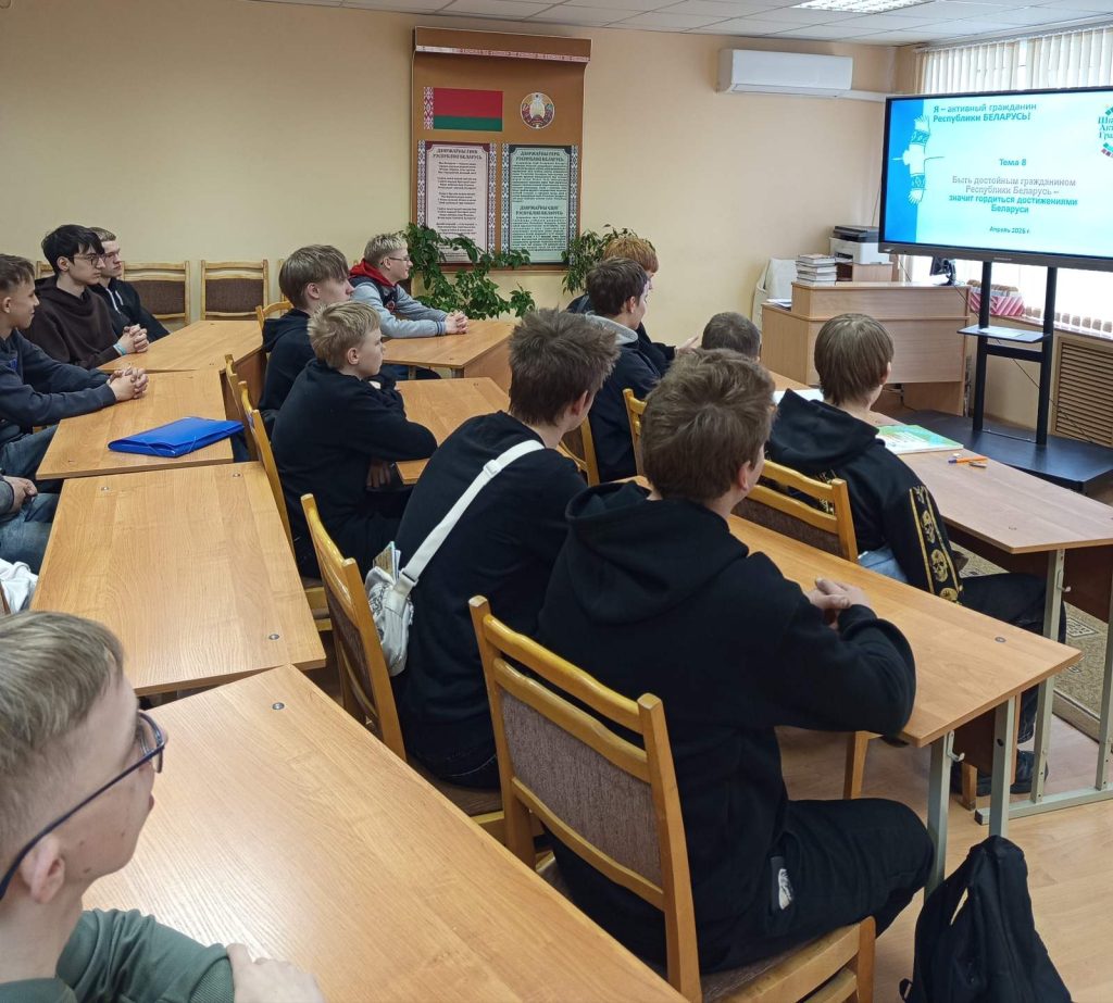 23 апреля 2026 года в учебных группах УО «Жлобинский ГТК» прошло мероприятие информационно-образовательного проекта «ШАГ» на тему «Быть достойным гражданином Республики Беларусь — значит гордиться достижениями страны». Оно началось с актуализации знаний учащихся о достижениях Беларуси в области экономики, образования, науки, спорта и медицины за последние годы. Далее учащиеся ознакомились с разделами «Космическая держава», «Мирный атом», «Прорывные биотехнологии» и «Сильная экономика» пособия «Я — гражданин Республики Беларусь». Также ребятам продемонстрировали тематический видеоролик. Мероприятие способствовало укреплению позитивного отношения к труду, развитию национальной гордости и пониманию личной ответственности каждого гражданина за строительство сильного и независимого государства.