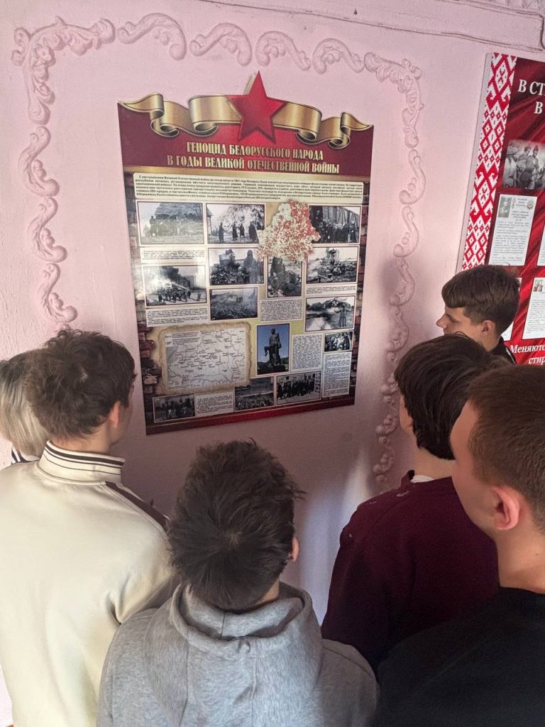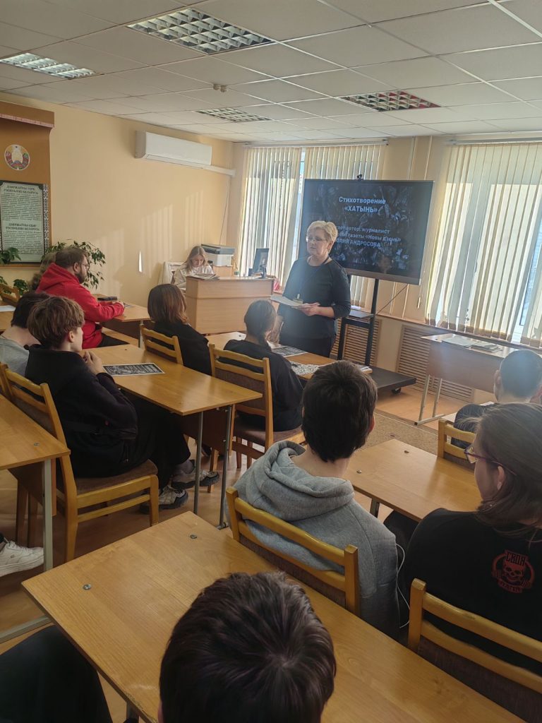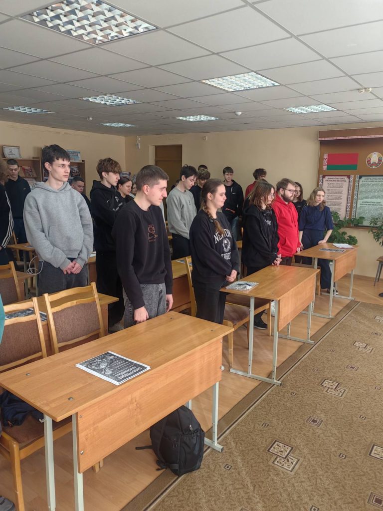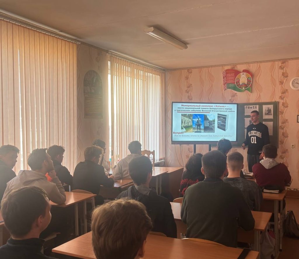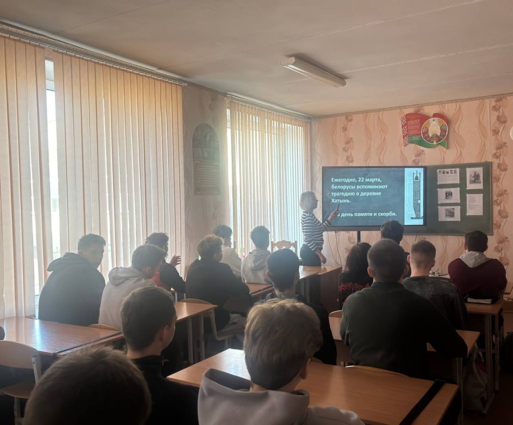 19 марта в учебных группах третьего курса прошел единый урок, посвященный трагедии в д. Хатынь. В ходе урока обсудили план «Ост» и «Новый порядок» — политику геноцида, от которой пострадали миллионы белорусов. Мемориальный комплекс «Хатынь» — место национальной памяти белорусского народа о трагических событиях Великой Отечественной войны. Хатынь учит: мы обязаны сохранить мир и независимость.
