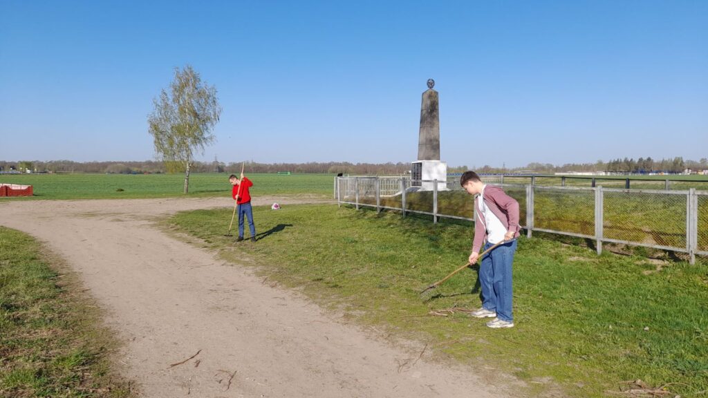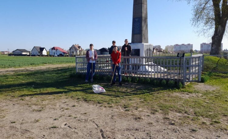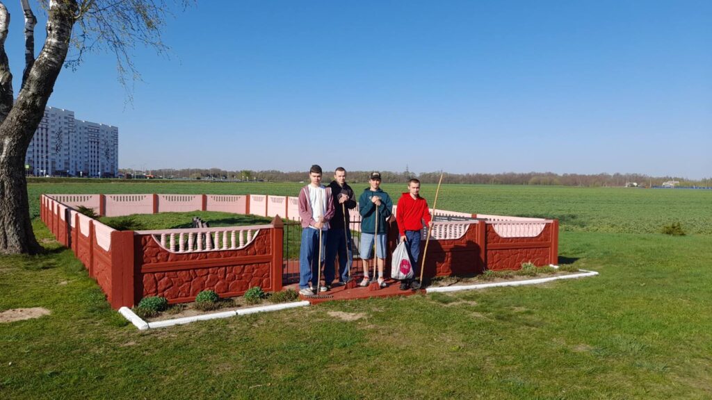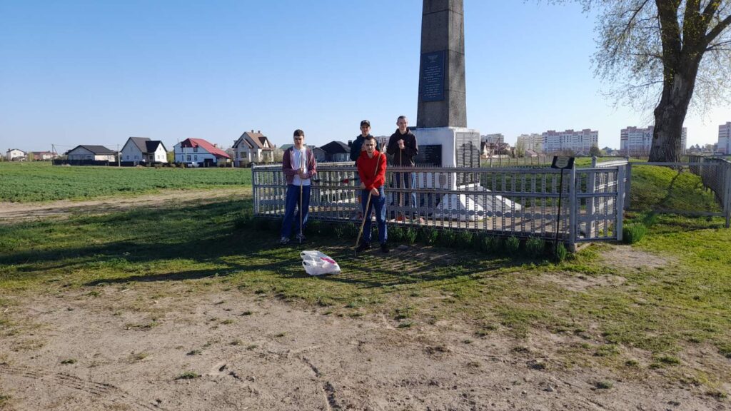Группа учащихся УО «Жлобинский ГТК», в рамках проводимых мероприятий, посвящённых 80-летию Великой Победы, навели порядок на территории массового захоронения мирных граждан в д. Лебедевка, расстрелянных в годы войны немецкого — фашистскими захватчиками.