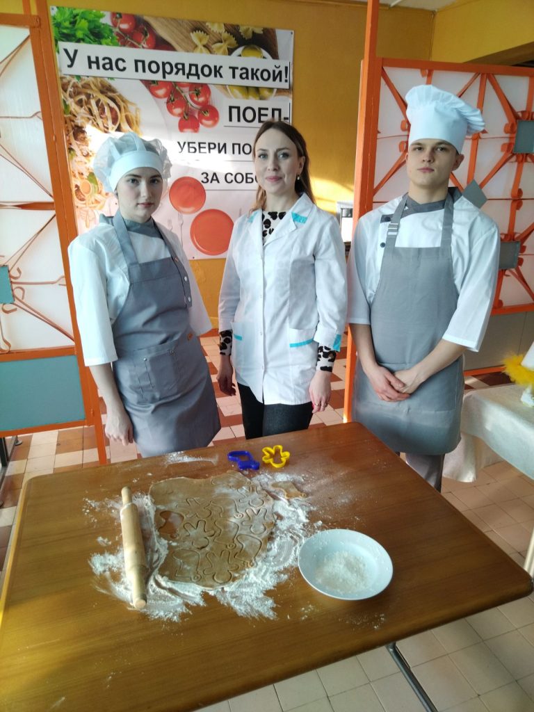Преподаватель Лобода Г.А. и учащаяся группы 121 Шаталова Е. провели игру и экскурсию по учебным кабинетам и ознакомили с современным оборудованием, которое активно используется в учебном процессе. Мастера ПО Гулюта Е.Ю. и Алейник Н.Г. провели мастер-класс по приготовлению песочного печенья. Ребята также продегустировали борщ и солянку, смогли узнать больше о профессии, насколько разнообразна и интересна эта сфера деятельности.