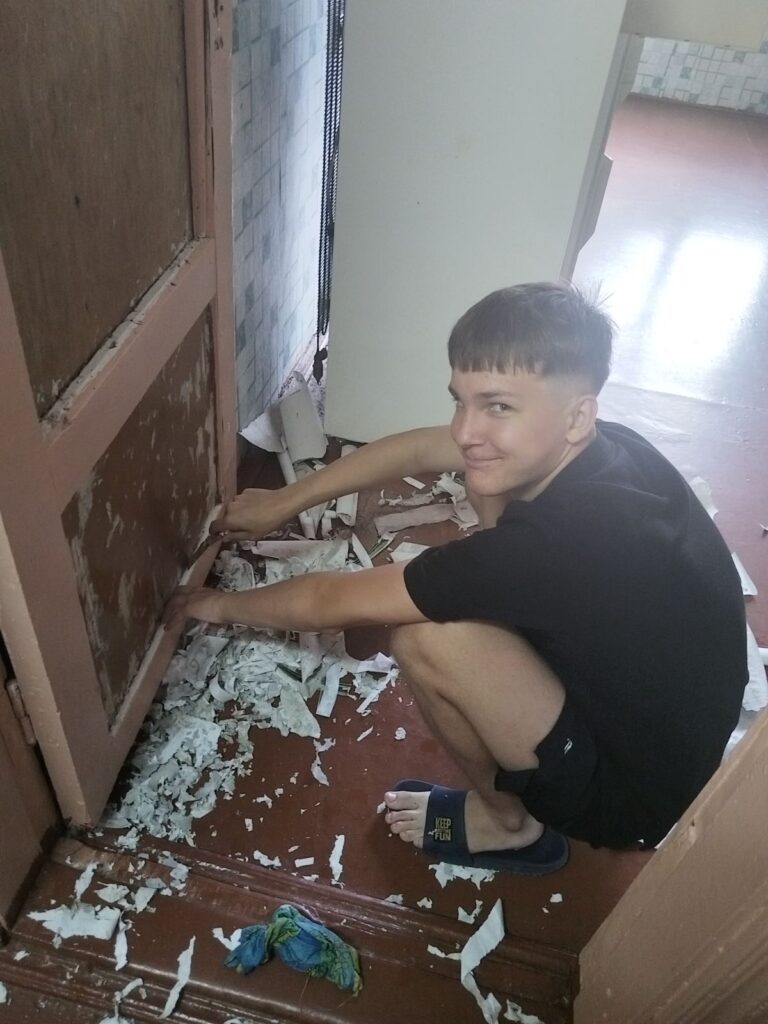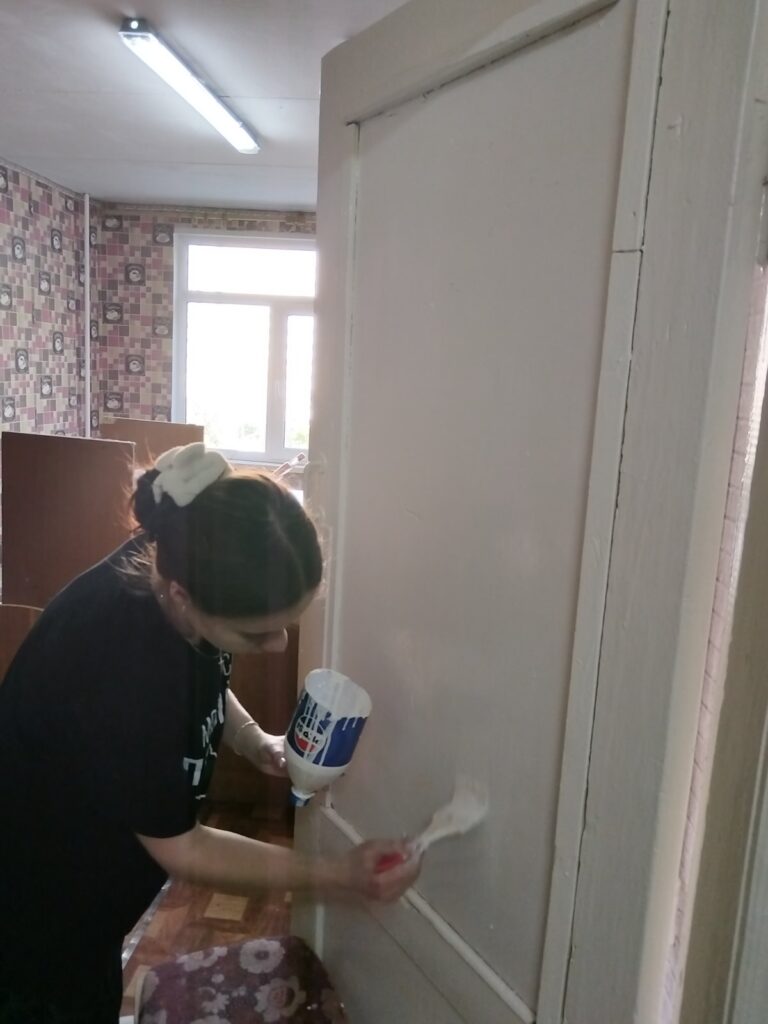 Парни и девушки обновляют внешний вид блоков: красят полы, двери, делают мелкий ремонт мебели. Работы по ремонту они выполняют качественно и с душой. Ребята хотят оставить о себе только хорошее впечатление, поэтому делают всё на 10 баллов.