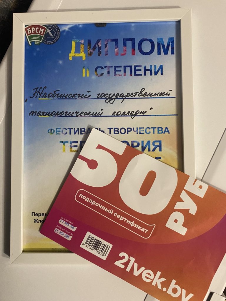 27 ноября 2025 года учащиеся УО «Жлобинский ГТК» приняли участие в фестивале творчества учащейся молодежи «Территория». Ребята достойно защитили честь колледжа и заняли почётное 🥈 место. В награду получили диплом, сертификат и сладкий приз. Поздравляем!!!