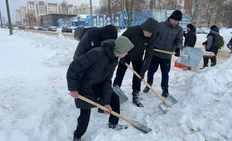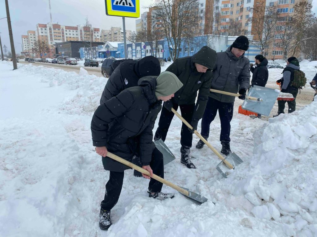Учащиеся и работники УО «Жлобинский государственный технологический колледж» помогают бороться со стихией. Будущие работки агропромышленного комплекса вышли на тротуары улиц города для очистки снега.