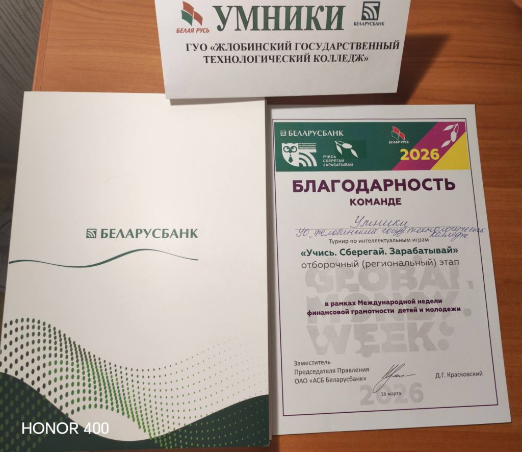 6 марта в рамках Недели финансовой грамотности команда «Умники» УО «Жлобинский ГТК» из числа учащихся нашего колледжа приняла участие в областном туре интеллектуального конкурса «Учись. Сберегай. Зарабатывай». Среди 27 команд Гомельской области ребята активно участвовали во всех 6 раундах, показали себя как эрудированные, внимательные, активные учащиеся. Общение со сверстниками, азарт, борьба, взаимовыручка — всё было на этой игре. Ярким финалом мероприятия стала встреча с талисманом ОАО АСБ «Беларусбанк» — харизматичной Зеброй, которая добавила праздничного настроения всем участникам.